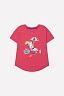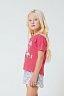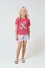 Футболка для девочки из однотонного хлопкового трикотажа супрем. Эластичная горловина. Короткие рукава со спущенным плечом. Для удобства переодевания в области плеча предусмотрена застежка на кнопки-ободок для 92-98 размеров. Удлиненная скругленная спинка, по центру шов. Спереди принт с блестками.Страна производитель Узбекистан.