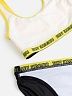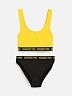 Раздельный купальник в черно-желтой гамме. Выполнен из эластичного, быстросохнущего и приятного к телу материала.Топ на широких бретелях. Плавки классического силуэта. Нижняя часть топа и пояс плавок декорированы жаккардовой тесьмой с текстом: SUMMER VIBES [Летние настроения – англ.].